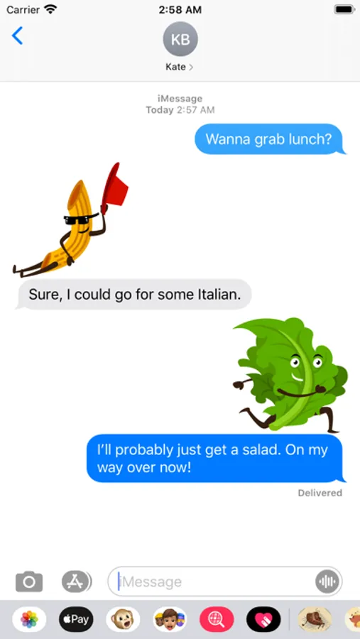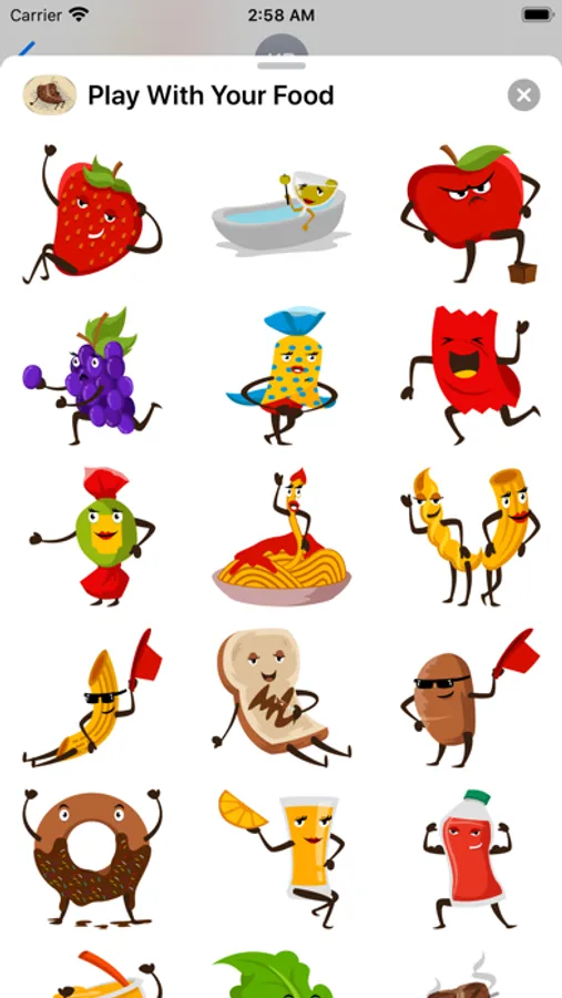 Experience food like you never have before with these wacky stickers. From a salad on the run to bathing martini, these sticker have it all. Enclosed in this sticker pack are 32 images of humanized foods and beverages. Perfect for expressing yourself and making texts more interactive, all stickers come ready to send. Just tap or drag your desired sticker into a text stream and let the party begin.