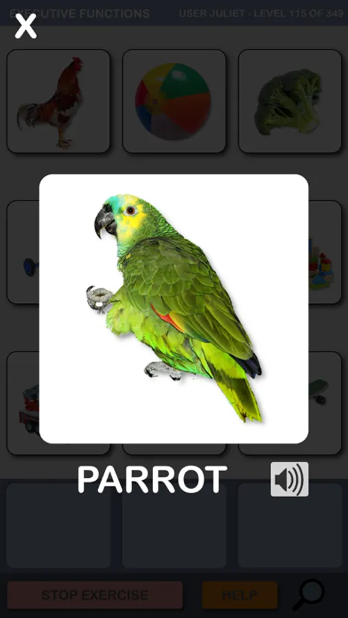 Each exercise/level is divided into two stages: during the first, a set of stimuli is presented which must be memorized. Then, in the second stage it is required to use, list and/or discriminate between the elements presented.