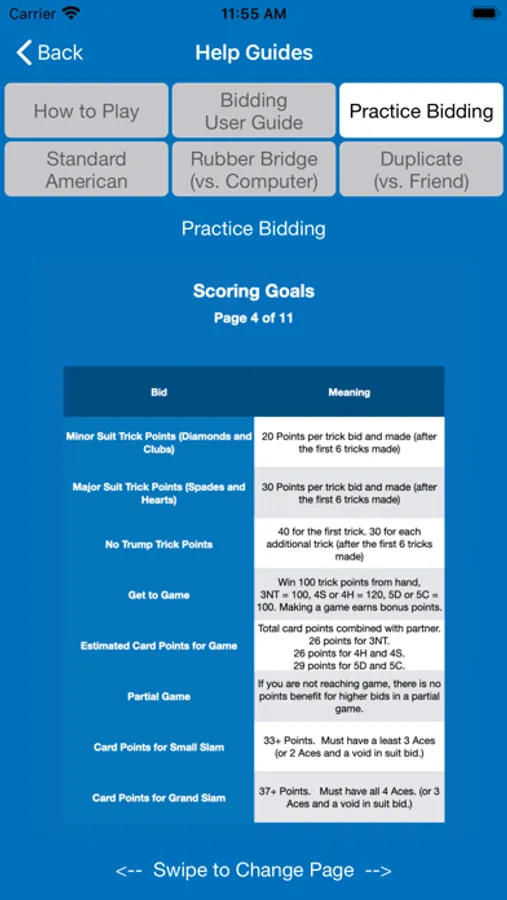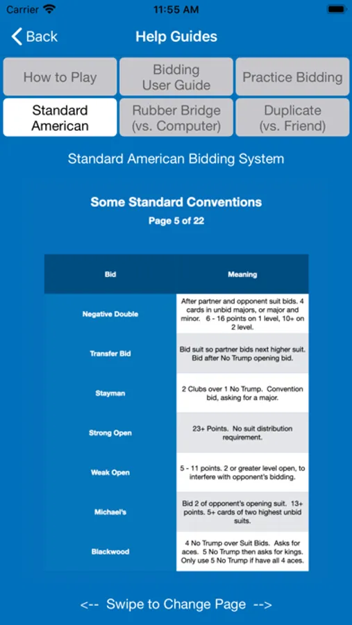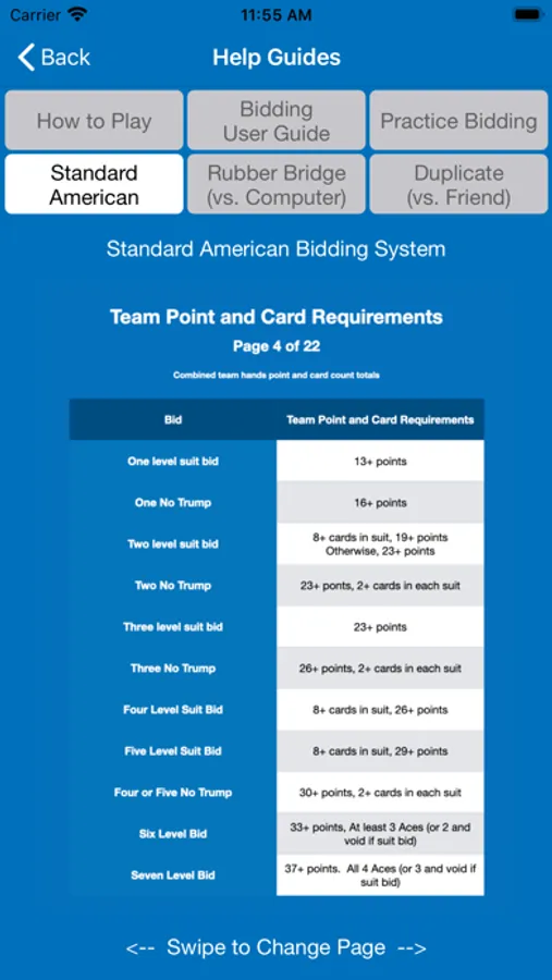 Extensive Bridge help guides, including How To Play and a guide to the Standard American bidding system.