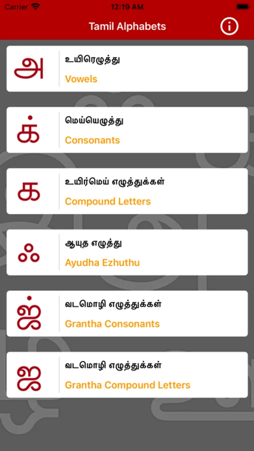 - App contain voice for each Tamil letter.