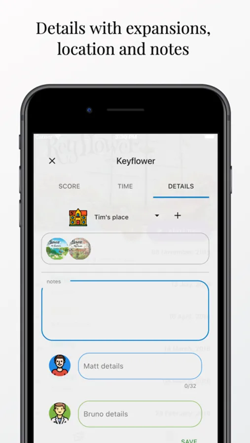 - Tracking board game plays (time, score, expansions played, notes, teams/roles, location, photos)