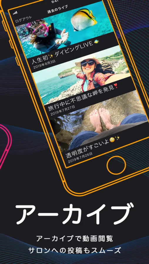 ライブ配信後の動画は、アーカイブ動画として一覧で確認でき、