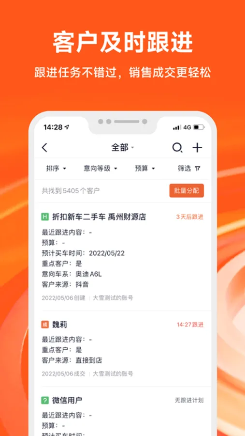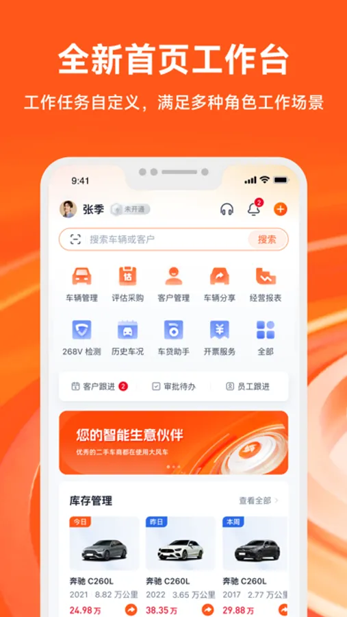 2. 客户管理。提供客户基本信息,购车意向、销售过程、跟进记录、等数据的管理。