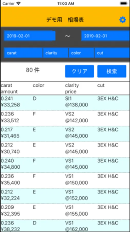 4C(carat, color, clarity, cut)と相場日付を指定し検索します。