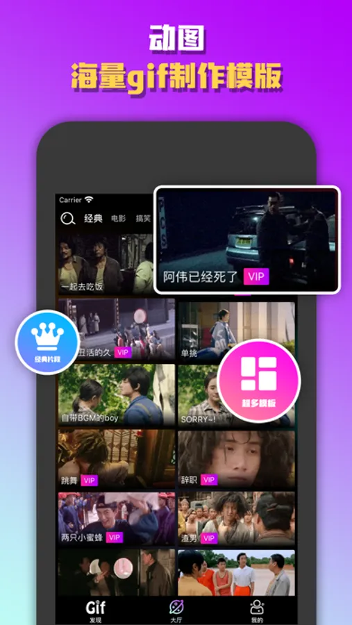上千款gif动图模板制作神器。可以对任何一个电影片段,电视剧片段,动漫片段等模板进行字幕使用及更改,轻松制作出属于自己的gif。