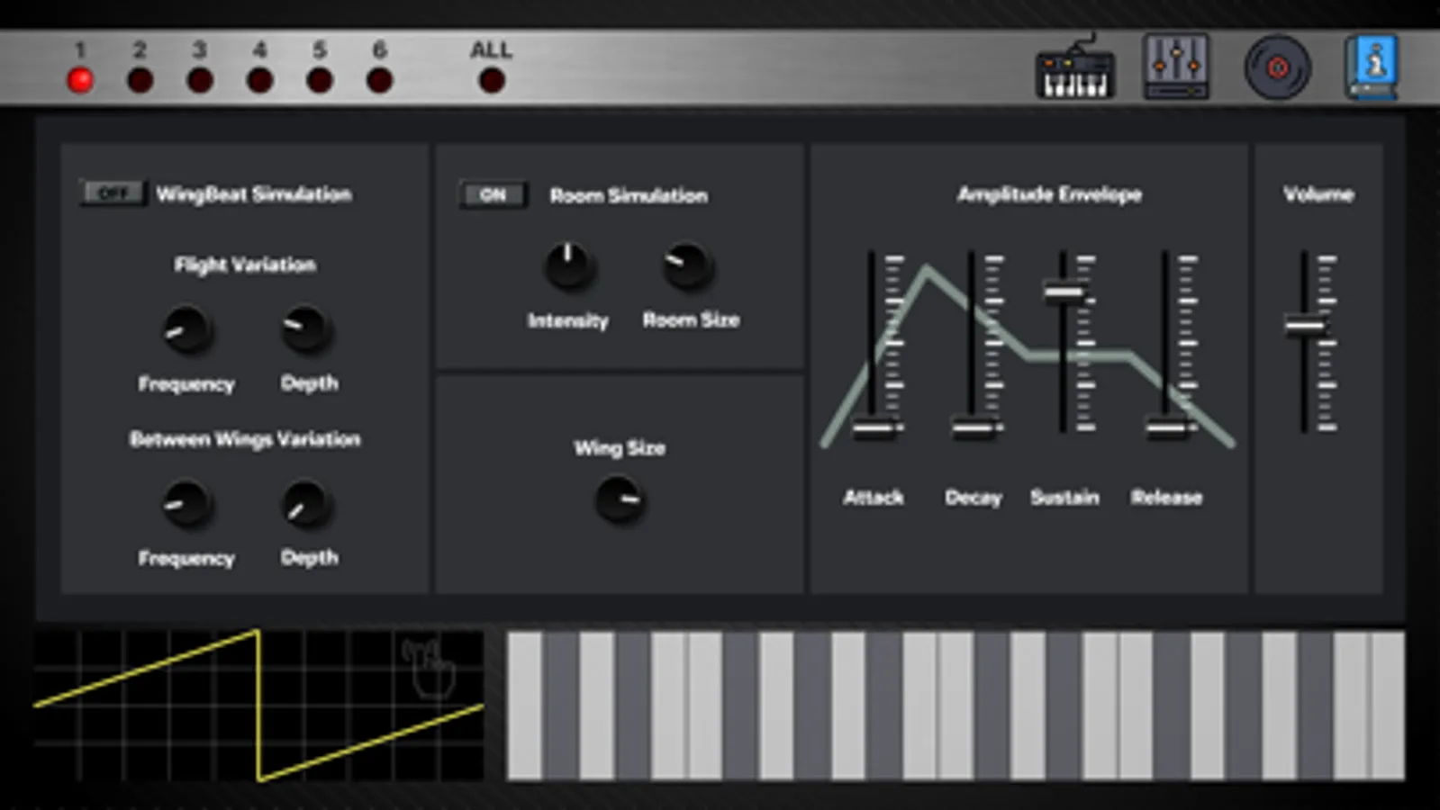 - You can modify sound using pitch modulation of wings, pitch variation between two wings, wing size filter, room reverb and amplitude envelope.