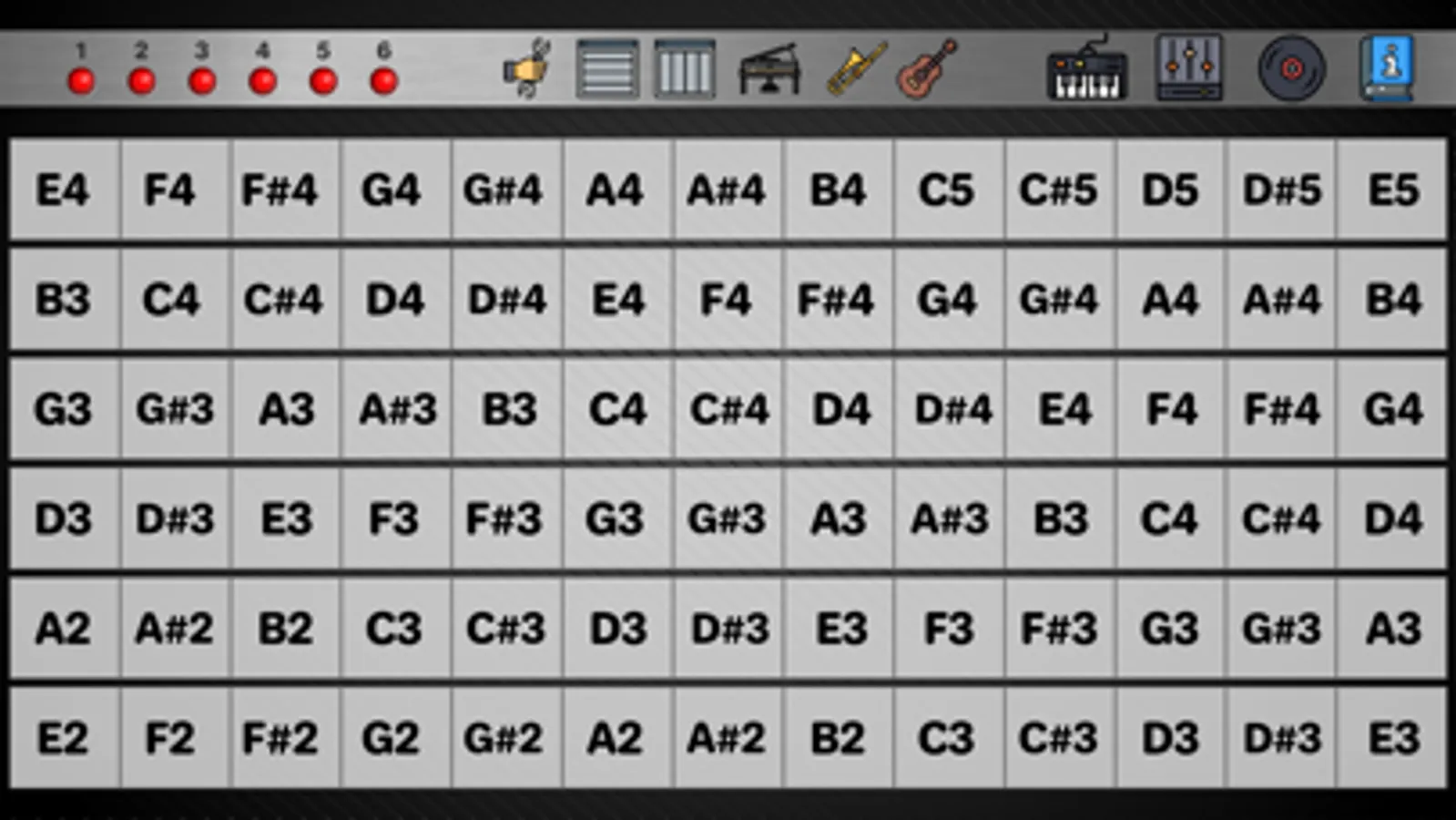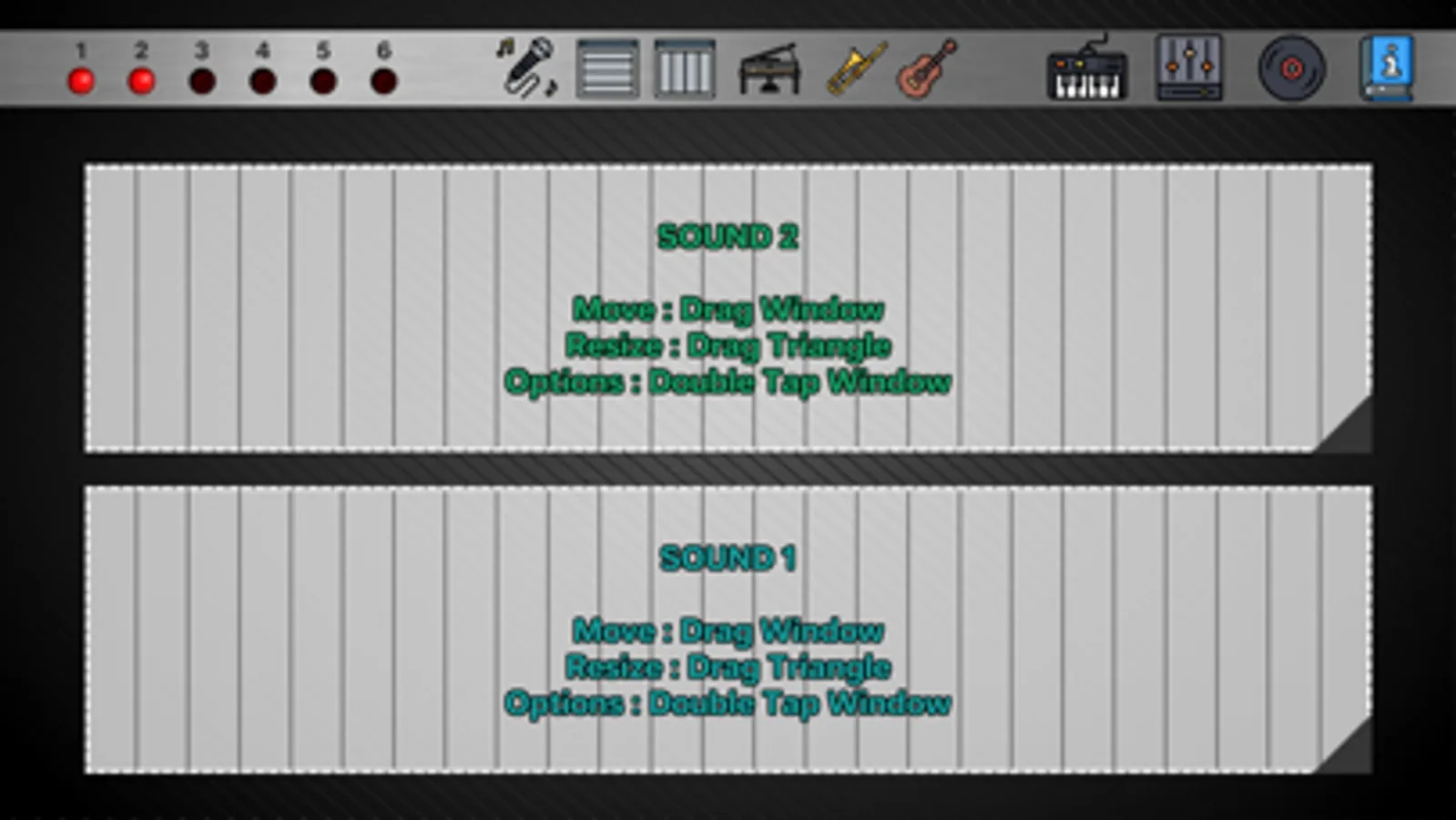 - Customize size, position, pitch range, velocity control(on/off), horizontal/vertical, continuous/discrete pitch, appearance(grid,note names) of sound panels.