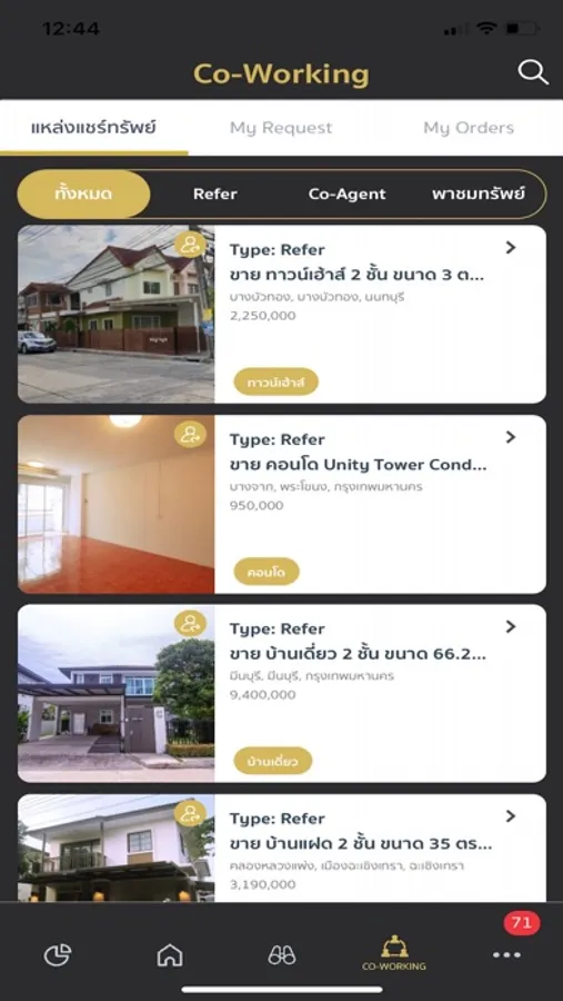 4. Co-Working เป็นศูนย์รวมตลาดแห่งการแลกเปลี่ยนทรัพย์ และหาทรัพย์หรือประกาศหาเพื่อนนายหน้าที่มาช่วยทำงาน มีทั้งการหานายหน้าในการช่วยนำทรัพย์ไปโฆษณาการตลาด(Refer) , หานายหน้าที่ติดผู้ซื้อ (Co-Agent) และ หานายหน้าช่วยเปิดห้อง (Co-Agent Open House)