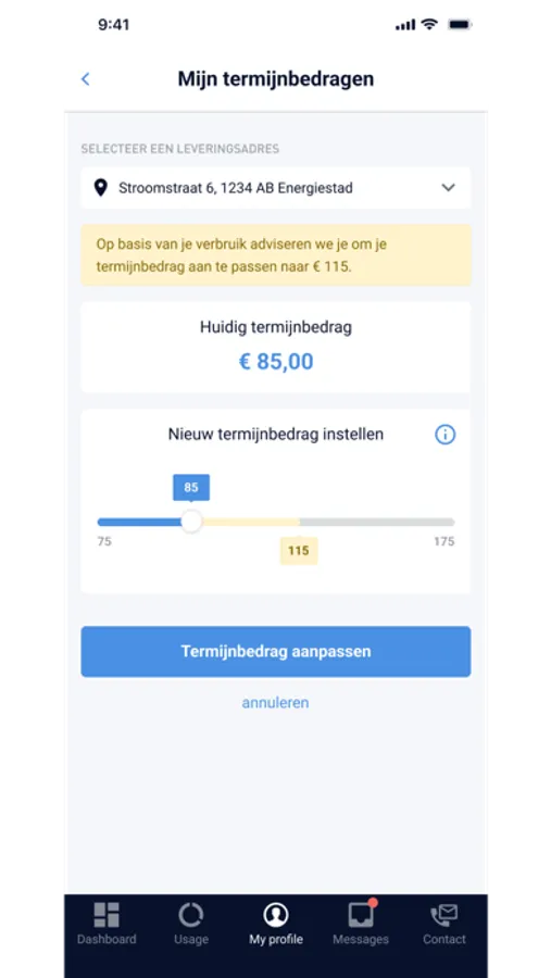 Do you want to view or change more information? In the app you will find all important information and you can adjust it immediately. Think of changing your monthly amount or contact details. Of course we also show all other data, such as your tariffs, bills and contract.