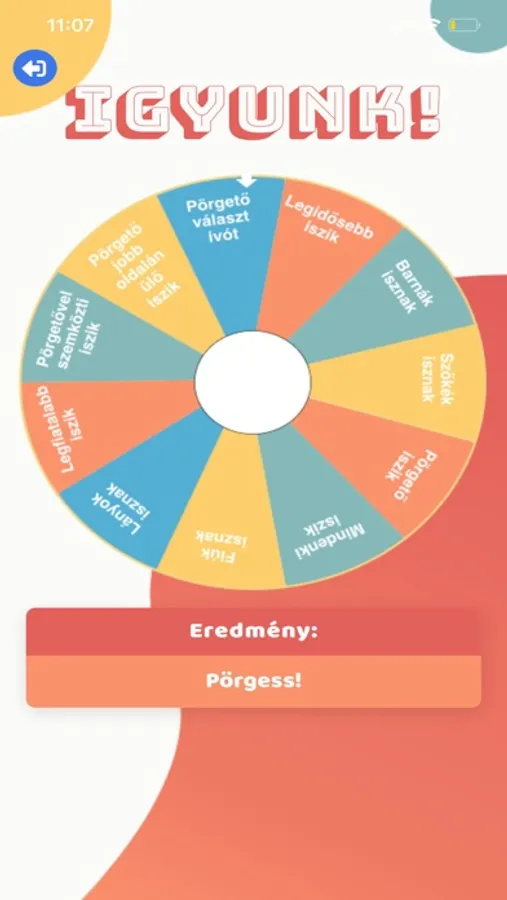Nincs más dolgotok, mint megpörgetni a kereket és ahol megáll a szerencsés(ek) iszik/isznak. Ezt folytassátok, amíg még el tudjátok olvasni az eredményt.