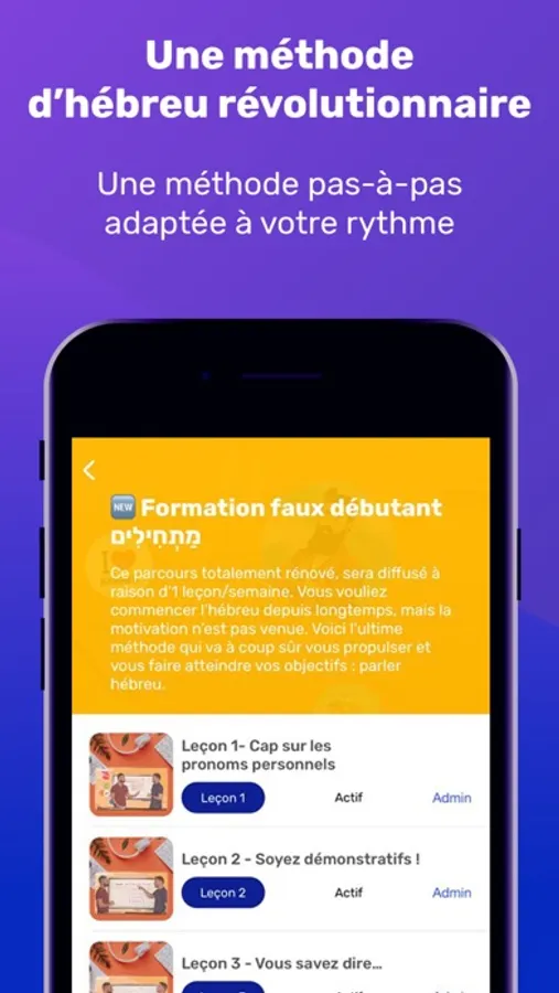 Mais encore pour ceux qui sont en préparation d’alya ou qui sont déjà dans un processus analogue, ils sont certains de trouver leur bonheur avec nous. À Cours d’Hébreu revendique pleinement une méthode extrêmement efficace, si ce n'est LA PLUS efficace. Le programme peut se suffire à lui-même ou s'ajouter à tout autre support pédagogique que vous auriez pu croiser sur votre chemin.