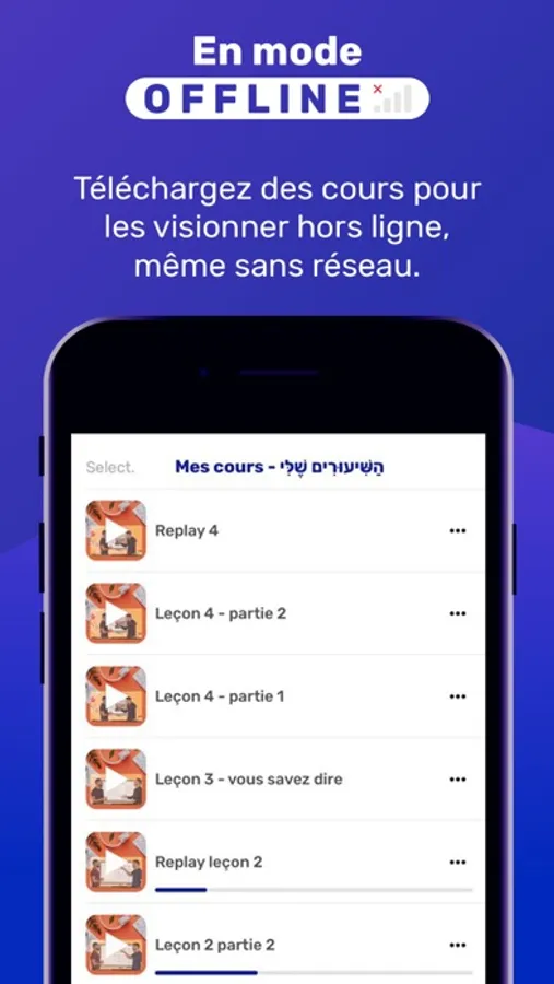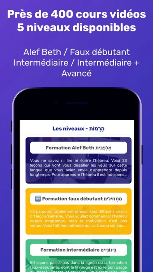 Après le succès du site Acoursdhebreu, nous avons décidé de mettre à la disposition des utilisateurs l'intégralité de nos formations en mode hors connexion pour apprendre l'hébreu sans être victime d'une coupure de réseau. Comme ça plus de raison de ne pas vous y mettre.