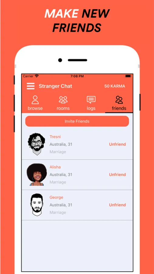 Rest assured, all the features of our stranger chat are available to you from the start. Chatting will always be free( premium features can be purchased) in our stranger chat, but you need to keep and grow your Karma!