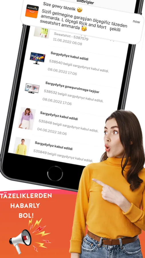 Köýnek, balak, sagat, ädik, şypbyk, uly ölçegli eginbaşlar, kurtka, palto, sport köwüşleri, futbolka, jempir, jeans we öý tekstiline degişli ähli zat Markayoly’da!