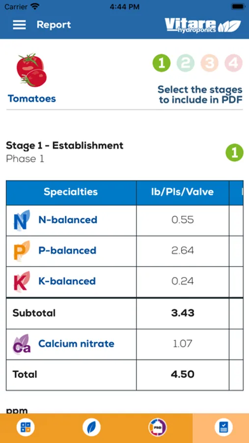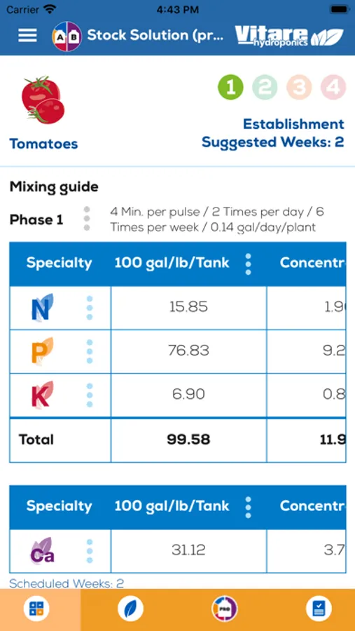 To simplify its use, Vitare™Calc provides the grower with predesigned nutrient recipes for most hydroponic crops, however, the app allows the user to manipulate the nutrient levels and doses, making it perfect to fit the demands of any greenhouse operation.