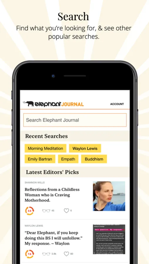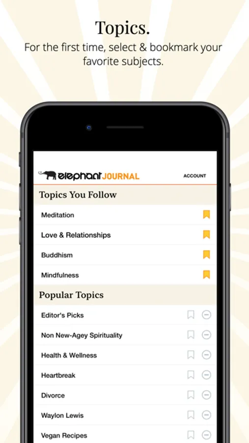 TOPICS: Browse articles by category (Yoga, Family, Green, Politics, Recipes…), bookmark those you love, and snooze the ones you don’t.