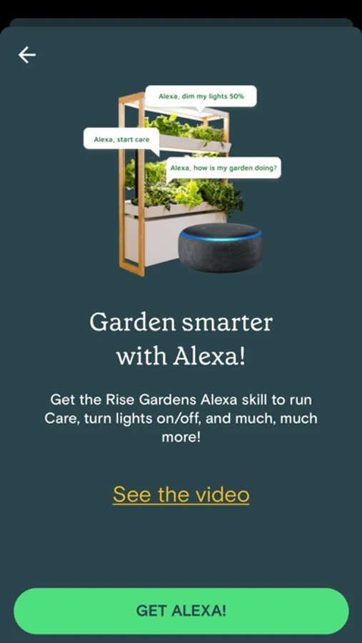 Connect your Rise Garden to Alexa for a complete smart home experience. She makes it easy to turn your garden’s lights off when watching a movie with your family and can give you reminders to prune or harvest your plants.