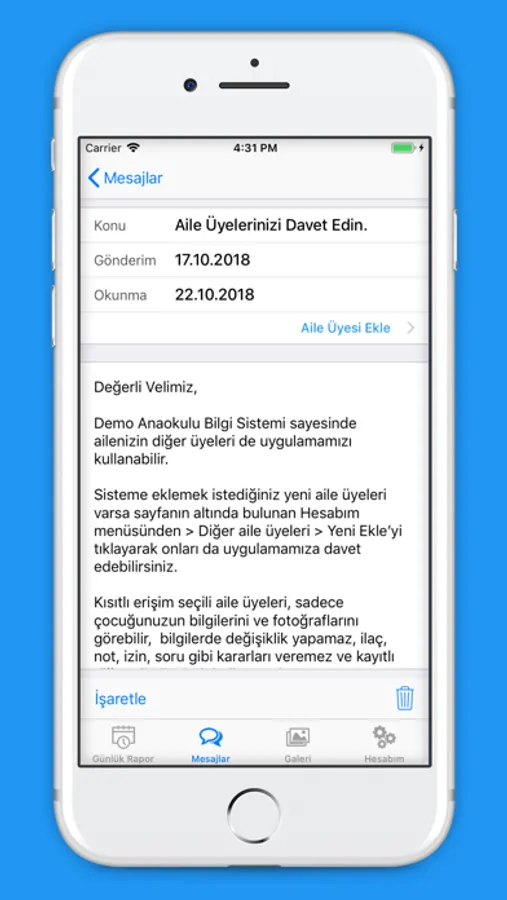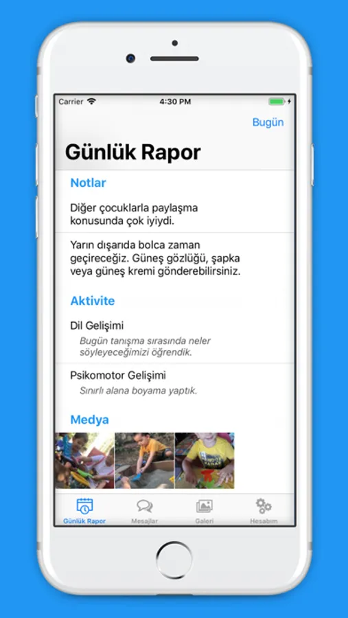 Mobil uygulamamız sayesinde çocuğunuz hakkındaki bilgi ve gelişmelere kolayca ulaşabilir, gelişimini daha etkin takip edebilir, paylaşılan fotoğrafları anında görebilir ve bizlere daha hızlı erişebilirsiniz.