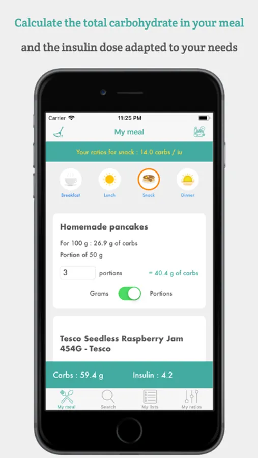 * Before each meal, select the foods and dishes that you are about to taste, indicate their weight, and the application will automatically indicate the amount of carbohydrates in your plate and give you the dose of insulin corresponding to your ratios.
