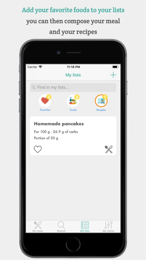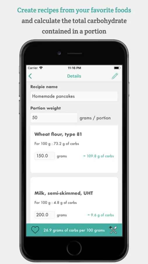 * Add your favorite foods to your list and indicate the number of carbs per 100g and the weight of a serving.
