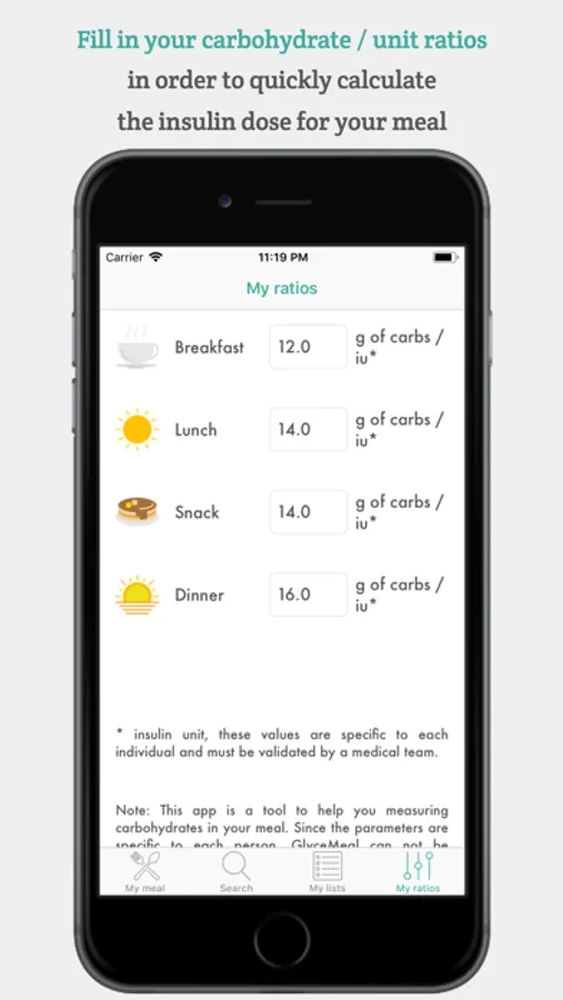* Add your ratios: carbohydrates per unit of insulin.