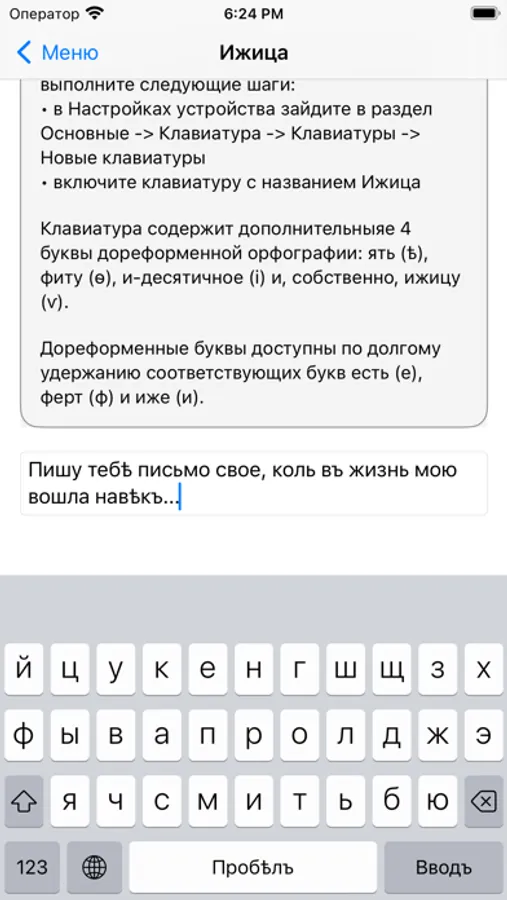 Буквы ь, е, ять и и-десятичное позволяют печатать ер (ъ), ё, фиту и ижицу соответственно долгим удержанием.