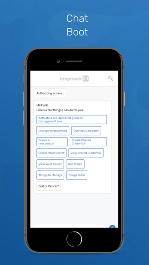EmpowerID Chatbot is an intelligent virtual assistant. You can interact with EmpowerID Chatbot to perform self-service identity and access management. It can also proactively reach out to users when it detects a need for user involvement, such as to notify them of new tasks to approve or if user's account has become locked out. Some of the other features of EmpowerID Chatbot include Create Person, Create Secrets or Credentials, Connect to Computer, etc.