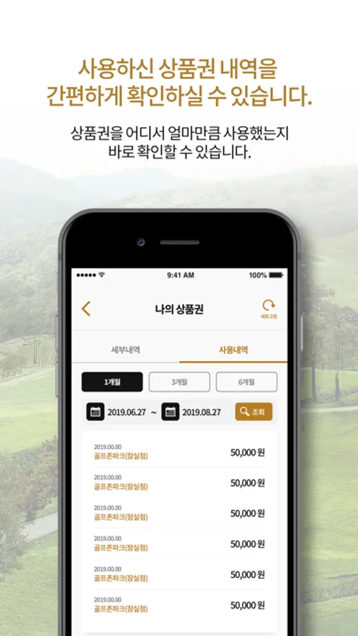 모바일 골프문화상품권의 구매, 사용, 선물, 전환에 관한 모든 내역을 확인할 수 있습니다.
