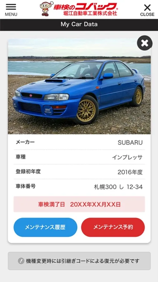 一度店舗へご来店いただきお車の登録がある場合、アプリに必要情報を入力していただくと、ご自身のお車の車検時期などがアプリ上でご確認いただけます!
