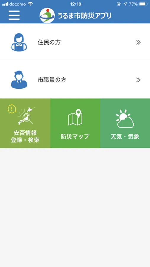 このアプリをスマートフォン、タブレット端末にインストールし、住民/市職員のユーザ区分を選択していただくことで、ご利用可能となります。