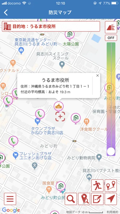 ・お近くの避難所・公共施設・公衆電話を標高に応じて検索できます。