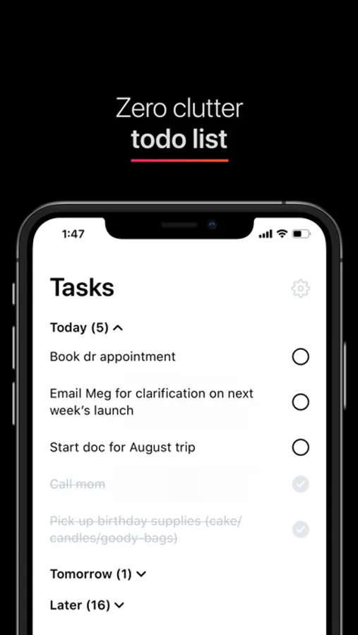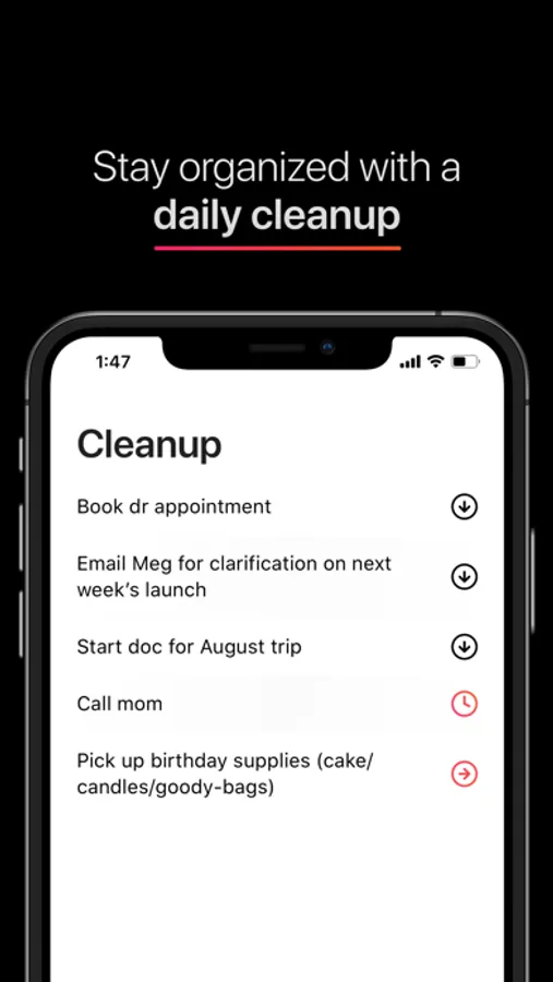 The zero clutter todo list – stay on top of your tasks with a daily cleanup process and plan your task to get done today, tomorrow, or later. Review and prioritize your tasks and stay on top of what needs to get done.