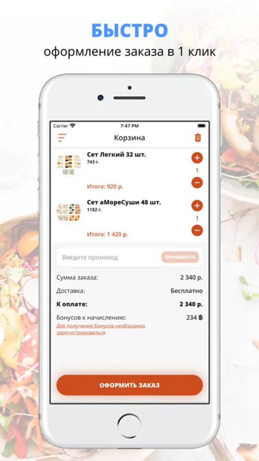 Скачивайте наше приложение, оформляйте заказ и наслаждайтесь любимой едой, где бы Вы ни были! Приятного аппетита!