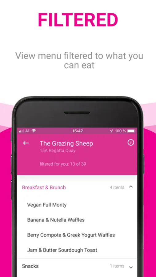 Take a few moments to tell the app your dietary preferences by clicking on the “Navigation Icon” in the top left of the “Nearby” page and selecting the “Profile” link. Now when you view a location you'll find the menu personally filtered to your needs.