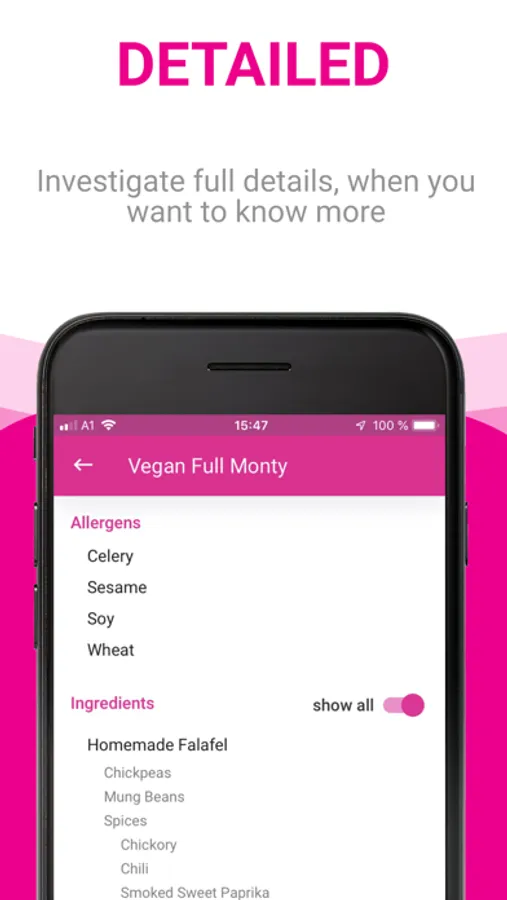 Imagine if you know the ingredients and nutritional value of all the meals and snacks around you. When you visit a restaurant, café, shop or mobile caterer you find a personally filtered paperless menu, that matches your dietary needs, directly on your phone.