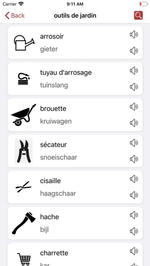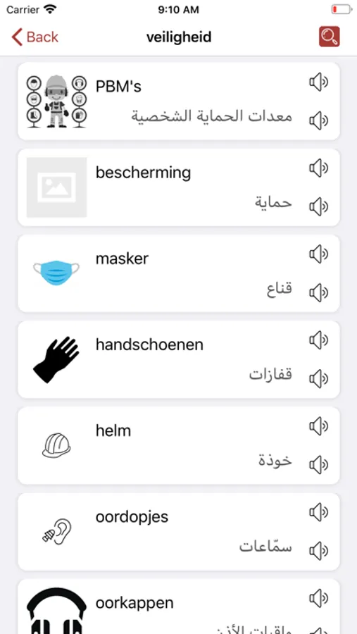 The vocabulary packages are developed in conjunction with the VDAB and Forem, and the sectors concerned. Sector-specific terms are structured into logical categories (tools, machinery, parts, maintenance, procedures, etc.) so that users can quickly scroll down to the right word. A search function (with auto-complete) for the different languages is also provided. Users can also set favourites.