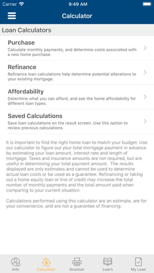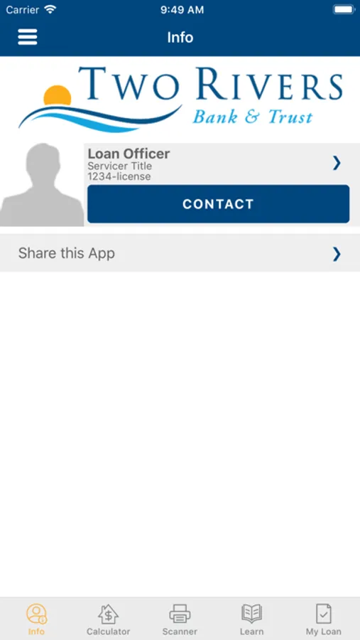 The calculations provided by the My Neighborhood. My Mortgage. mobile app are useful in giving you an idea of what homeownership might mean for you. However, please be sure to contact your Two Rivers Bank & Trust Loan Officer for a customized solution tailored to your specific financial situation, needs, and goals. Your Loan Officer can also assist you with any questions you have about your loan and the loan approval process.