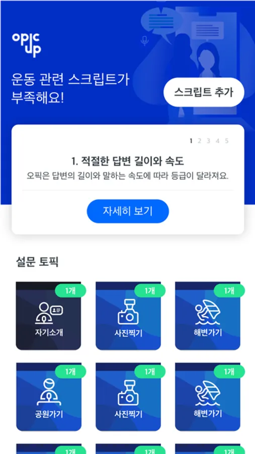 내가 관심있는 주제별로 토픽을 학습하면서 원어민 발음에 얼마나 가까운지 확인하고 시험장에서 답변할 스크립트를 준비하고, 직접 시험도 보고, AI 평가도 받을 수 있는 오픽 준비 필수앱 지금 바로 이용해보세요.