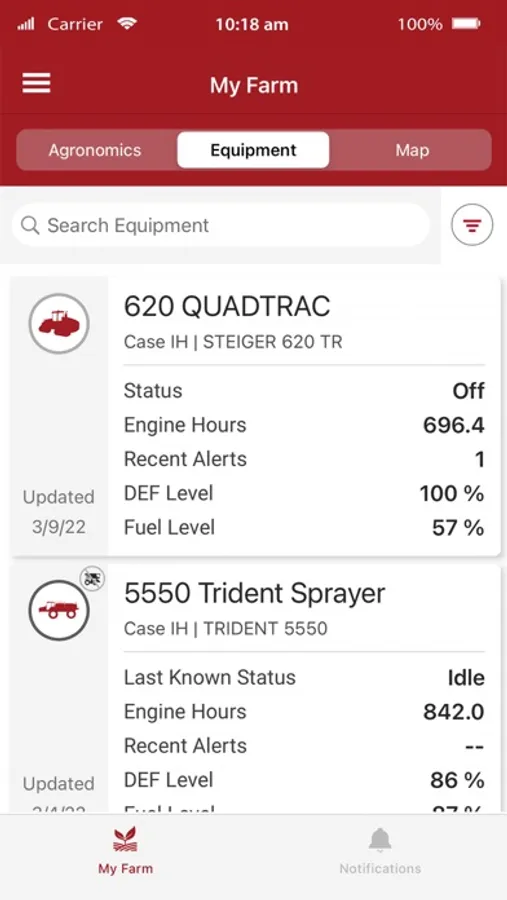 - Track the status of your in-field machinery and analyze their critical metrics directly from your mobile device