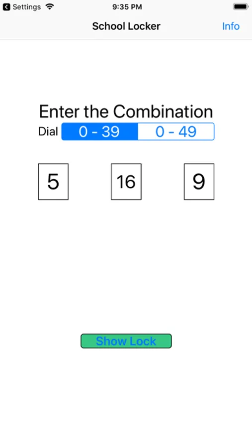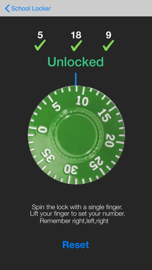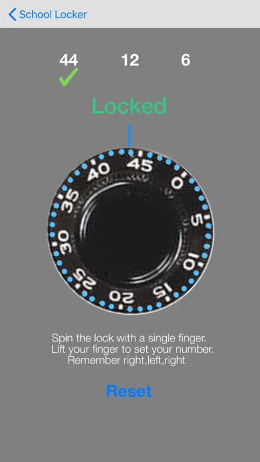 If there are lockers with locks at your school, you'll probably want to get used to opening yours quickly. This App gives you a chance to practice. This uses a right, left, right opening sequence and forces the correct direction for each combination number.