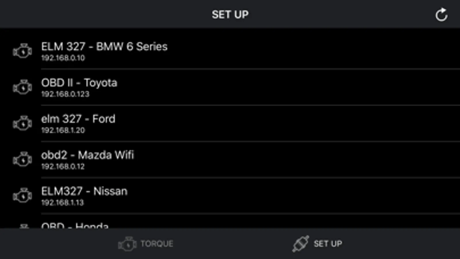 - Open app: Click "SCAN" to get list OBDII / OBD2 / ELM327 devices list via wifi and select. (Make sure you connect correct device - default is 192.168.0.10 or 192.168.0.123)
