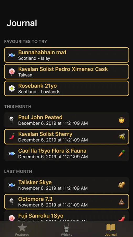 Save whiskies you want to try in your favourites list, log whiskies into your journal (tagged with emoji) and add keep track of your own personal tasting notes.