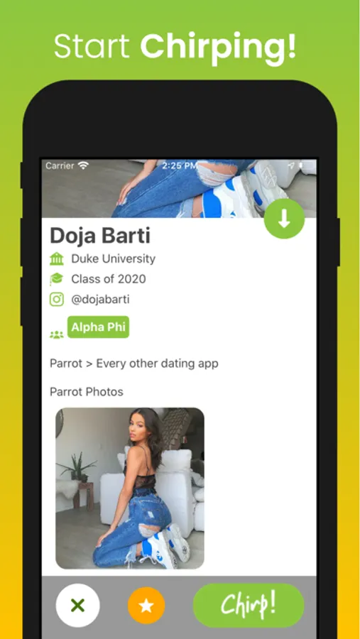 Parrot empowers users to shoot their shot without fear, stress or embarrassment by sending chirps to fellow students they like on campus. If two users unknowingly chirp each other, it's a Pair!