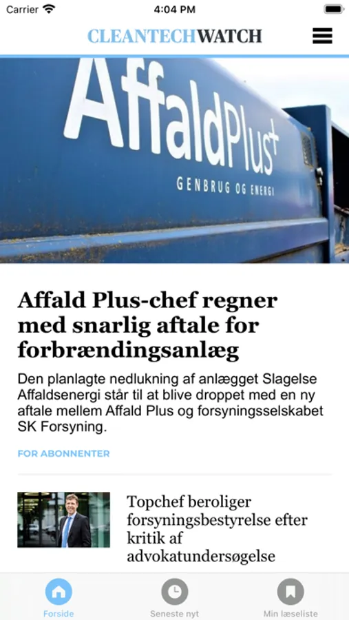 Med CleantechWatch-appen har du altid uafhængig, kritisk og fair journalistik om miljøteknik, ressourcer, forsyning og regulering lige ved hånden.