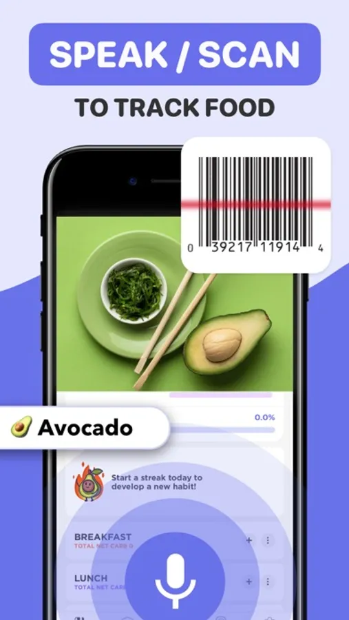 So wherever you go, you have an app to track your food via search, barcode, and voice. Scan barcodes, use your device’s microphone to say what you ate, create custom meals, or use our HUGE databases of common foods, restaurants, groceries, and USDA!