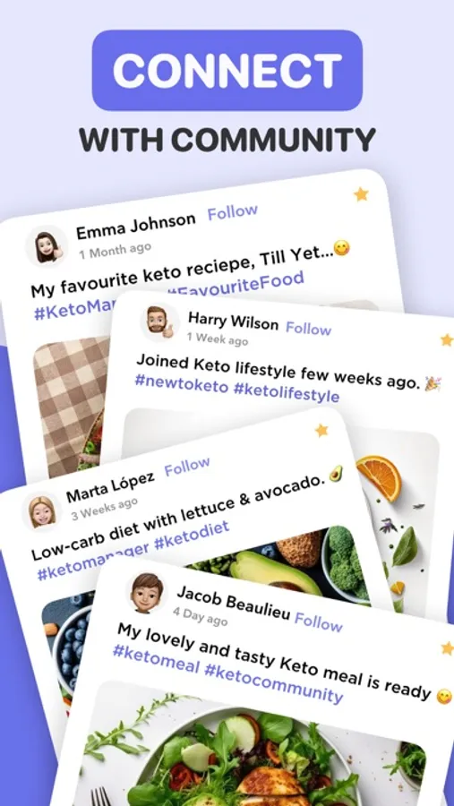 The Keto app makes it easy to connect with people, start activity challenges, share success stories, your favorite keto recipes, and your keto journey with an uplifting community. Join the Keto community to connect with new people and share logs to help stay motivated and be inspired by others who are doing amazing things in their journey.