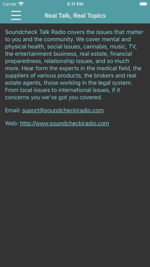 Soundcheck Talk is the talk station within the Soundcheck iRadio Network. We cover local information and topics that our listeners relate to including mental and physical health, real estate, financial health, retirement, marijuana, music and the entertainment industry, technology, cultural issues and so much more. Hear from the experts in the medical field, CEO's of businesses, athletes and musicians as well as people fro everyday walks of life.