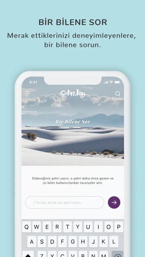 Seturday’in “Bir Bilene Sor” sekmesinde seturday.com’a üye olan kullanıcılar birbiriyle etkileşime geçerken, seyahat edecekleri lokasyon hakkında birbirlerinden tavsiyeler alabilecek ve böylece gezginler deneyimlerini bu platformn üzerinden paylaşabiliyor.