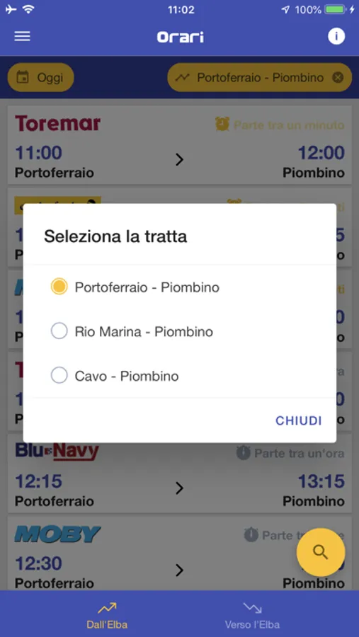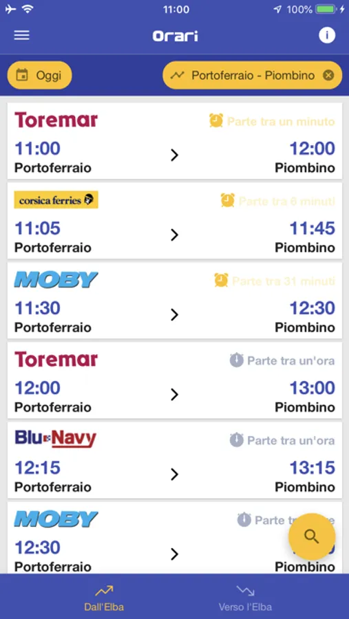 Elba Ferries App enables you to find out the frequency and times of all the crossings to and from Piombino and the Island of Elba, and it is completely free. Once you have downloaded this App, you can quickly and easily view the complete, up to date timetables of each of the four Shipping Companies that cross to and from Piombino (Toremar, Moby Lines, Blu Navy and Corsica Sardegna Ferries) and all the ports in the Island of Elba: Portoferraio, Rio Marina and Cavo. Should you need to, you can also change the times and dates of your booking in no time so you can choose the time and date that suits you best.