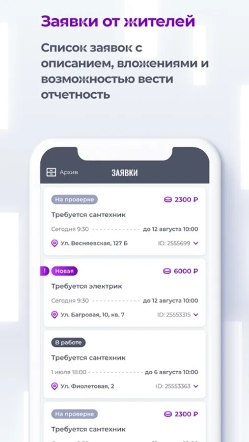 • Получение заявок от жителей с описанием проблемы и приложенными фотографиями;